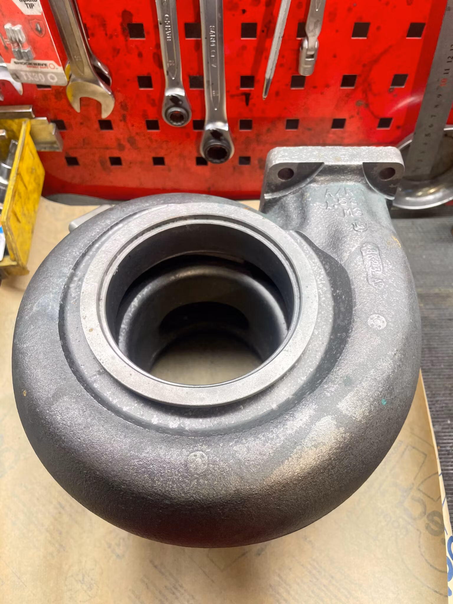 Avgashus / exhaust housing till CAT C18 motorerna med en stor turbo och inte dubbelturbo varianten. Obs, detta är modellen där turbon endast är oljekyld och inte kyls av vatten, se bilder och turbonummer. På vattenkylda avgashuset så sitter wastegateklockan på andra sidan på huset.