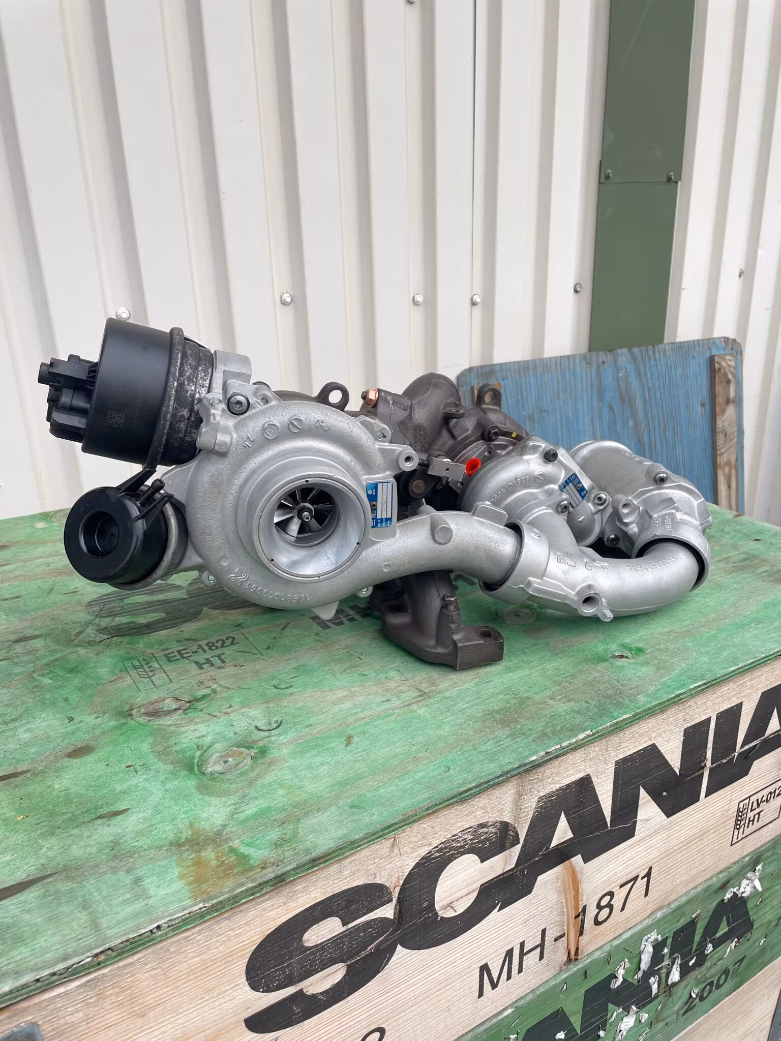 Dubbelturbon består av en stor K04 turbo 5304-970-0139 som är lågtrycksturbon och en liten KP35 turbo som är högtrycksturbon. Ja lilla är högtryck och stora lågtryck.